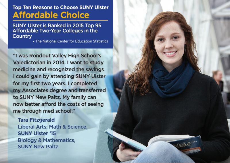 The cost of attending a four-year college is high and going higher. You can greatly reduce the cost of gaining a bachelor’s degree by graduating from SUNY Ulster and transferring to finish to a four-year institution to finish your degree. At SUNY Ulster, 70% of our students graduate with no debt and more than 200 students per year receive scholarships. Discover how Tara Fitzgerald saved to reach her goals.